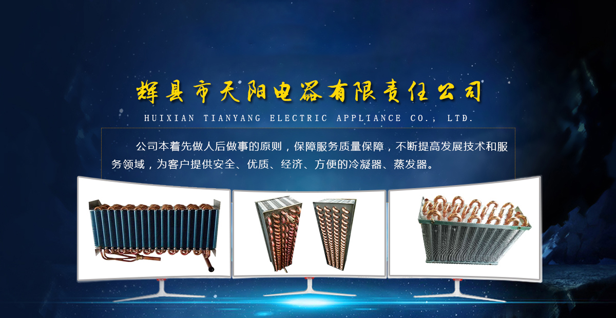 輝縣天陽電器有限責(zé)任公司位于肥沃的中原河南省輝縣市學(xué)院路中段工業(yè)集聚區(qū)興業(yè)園3號廠房,以制冷設(shè)備用冷凝器,蒸發(fā)器,熱交換器為主。主要材料為銅管鋁翅片,銅管銅翅片,鋁管鋁翅片。廣泛應(yīng)用于冰箱冰柜,制冷設(shè)備,暖通設(shè)備,空調(diào),自動(dòng)售貨機(jī),冷干機(jī),超市立風(fēng)柜,冷藏車,烘干機(jī)等產(chǎn)品領(lǐng)域?! 」咀?998年成立以來,始終堅(jiān)持:“科技造就產(chǎn)業(yè)、質(zhì)量成就信譽(yù)、誠信鑄就輝煌”的質(zhì)量方針,從產(chǎn)品拓展上堅(jiān)持“人無我有,人有我優(yōu),人優(yōu)我特的”經(jīng)營理念,25年來,從1998年開始供應(yīng)河南冰熊集團(tuán)下屬的冷柜廠,制冰機(jī)廠各種冷凝器;2003年之后,原冰熊集團(tuán)的精英志士開始在全國各地發(fā)展,所到之處依托我公司供貨,以致于多家目前已具行業(yè)中佼佼者的公司,從而建立了如凱雪公司,兆邦公司、凌云公司、海寶公司、正雪公司、上海忠云、山東德萊維等幾十余家公司在草創(chuàng)時(shí)期的啟蒙供貨商,友好共贏長達(dá)十余年,成為我國制冷行業(yè)的供應(yīng)商。以致在2015年初雙匯集團(tuán)面向社會的招標(biāo)書中指名要我公司冷凝器、蒸發(fā)器指定產(chǎn)品供應(yīng)商